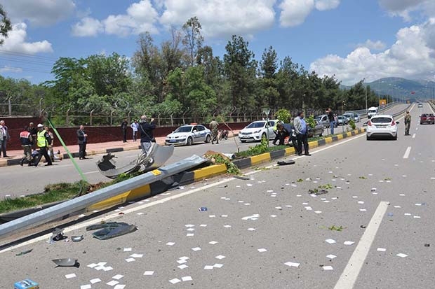 Aydınlatma direğinin de devrildiği kazada, Emniyet Müdürlüğü'ne ait sivil otomobildeki polis memurları Ömer Kılıç ile Mehmet Akif Korkmaz yaralandı. Hafif ticari araçta bulunan Hatice Önal'ın da yaralandığı kazaya görenler durumu polis ve sağlık ekiplerine bildirdi.