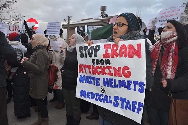 BM'nin, Halep'e yapılan saldırılara sessiz kaldığını iddia eden yaklaşık grup Türkçe, Arapça ve İngilizce sloganlar atarak İran ve Rusya'nın Halep'ten çıkmasını istedi. Bu sırada kadınlardan oluşan başka bir grup ise BM ofisine yürümek istedi. Emniyet yetkililerinin, ikna etmesiyle yürümekten vazgeçen grup bir süre daha slogan attıktan sonra olaysız dağıldı.