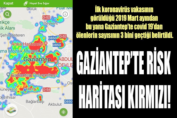Gaziantep Hayat Eve Sığar (HES) uygulamasındaki risk haritasında tamamen kırmızıya döndü.  En son açıklanan 100 bin kişilik nüfusa göre vaka sayısı haritasında yüzde 126.6 olan Gaziantep’te günlük vaka sayısının 700’ün üzerinde olması korkutuyor. Vaka sayılarının her geçen gün arttığı Gaziantep’te aşılama işlemlerinin artırılması için çaba gösteriliyor.