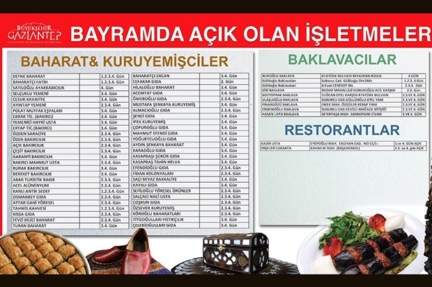 Gaziantep Büyükşehir Belediyesi tarafından kente gelen ziyaretçilere kesintisiz hizmet sunmak amacıyla bayramlarda başlatılan "Nöbetçi İşletme" uygulaması bu bayramda da devam edecek.
