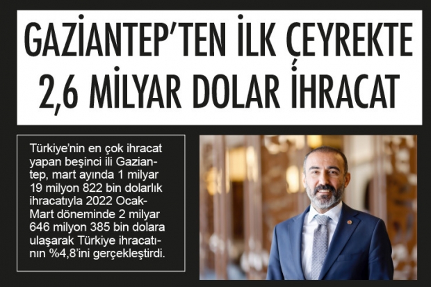 Türkiye’nin en çok ihracat yapan beşinci ili Gaziantep, mart ayında 1 milyar 19 milyon 822 bin dolarlık ihracatıyla 2022 Ocak-Mart döneminde 2 milyar 646 milyon 385 bin dolara ulaşarak Türkiye ihracatının %4,8’ini gerçekleştirdi.