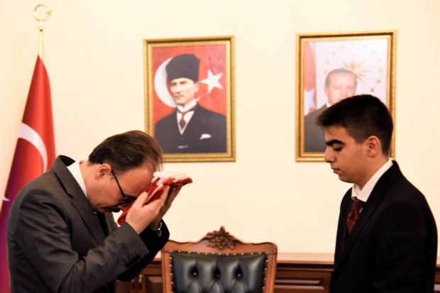 Bilecik Valisi Dr. Kemal Kızılkaya, 'Gaziantep'in Düşman İşgalinden Kurtuluşunun 100'üncü Yılı Etkinlikleri' kapsamında Gaziantep'ten toprak ve bayrak getiren öğretmen Mustafa Özcan ve öğrenci Cebrail Kellecioğlu’nu makamında kabul etti.