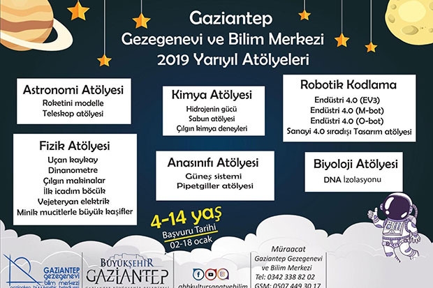 Gaziantep Büyükşehir Belediyesi'ne bağlı Gezegenevi ve Bilim Merkezi'nde yarıyıl tatili kurs kayıtları başladı. Kurslar 1-14 yaş grubu çocuklara hitap edecek ve kurslarda çeşitli atölye çalışmaları düzenlenecek. Başvurular 18 Ocak 2019 tarihine kadar devam edecek.