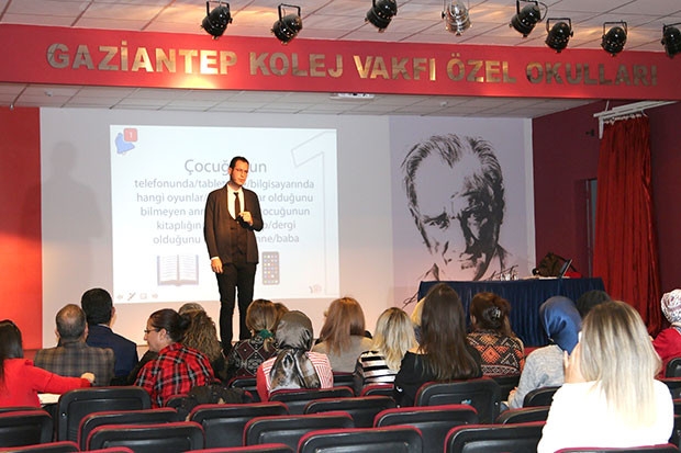 Gaziantep Kolej Vakfı Özel Okullarında düzenlenen Çocuğum ve Teknoloji Bağımlılığı Seminerinde öğrenci velileriyle bir araya gelen Doç. Dr. Yavuz Samur bilinçsiz teknoloji kullanımının önüne geçilmesi ve çocukların teknolojiyi doğru kullanmaları yönünde çeşitli bilgiler verdi.