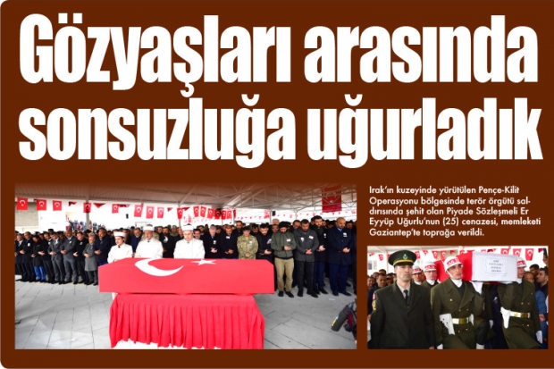 Şehit Piyade Sözleşmeli Er Eyyüp Uğurlu için öğle vakti Bahaeddin Nakıpoğlu Camisi'nde cenaze töreni düzenlendi. Törene Gaziantep Valisi Davut Gül, 5'inci Zırhlı Tugay Komutanı Tuğgeneral Hacı Halil Osma, İl Jandarma Komutanı Tuğgeneral Hidayet Arıkan, İl Emniyet Müdürü Mustafa Emre Başbuğ, milletvekilleri, ilçe belediye başkanları, kurum müdürleri, şehidin babası Celal Uğurlu, üvey annesi Fatma Uğurlu, kardeşleri ile silah arkadaşları katıldı. Bekar olduğu öğrenilen Eyyüp Uğurlu'nun Türk bayrağına sarılı tabutuna kapanan yakınları, uzun süre gözyaşı döktü.