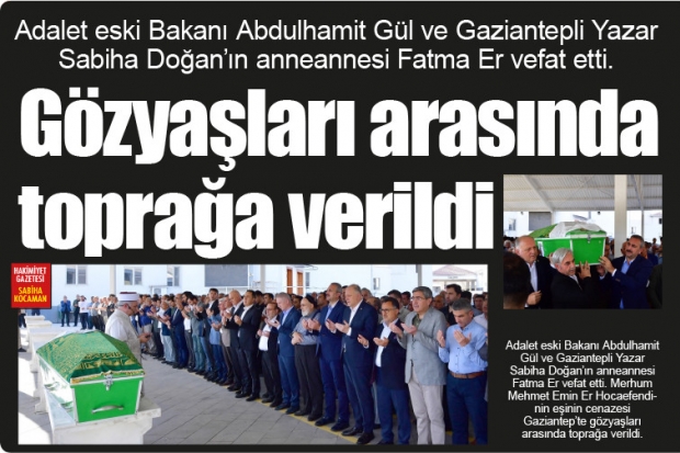 Adalet eski Bakanı Abdulhamit Gül ve Gaziantepli Yazar Sabiha Doğan'ın anneannesi Fatma Er vefat etti. Merhum Mehmet Emin Er Hocaefendinin eşinin cenazesi Gaziantep'te gözyaşları arasında toprağa verildi.