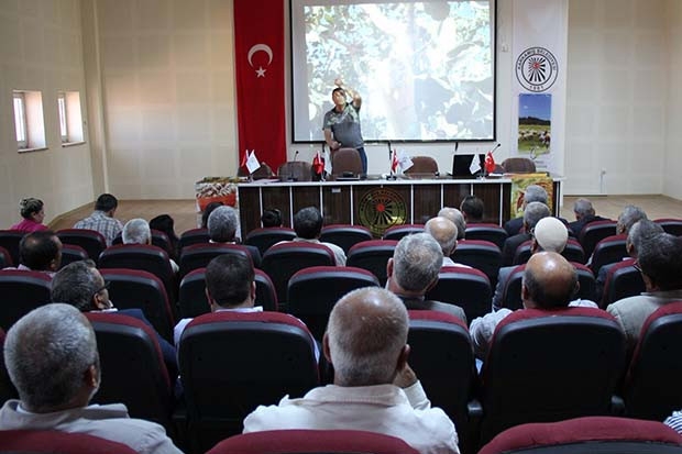 Gıda Tarım ve Hayvancılık İl Müdürlüğü Bitkisel Üretim ve Bitki Sağlığı Şube Müdürlüğünden Ziraat Mühendisi Kurban Nedret’in konuşmacı olarak katıldığı eğitimde, antep fıstığı üreticilerine budama ve toprak işleme konularında bilgiler verildi. Antepfıstığı üreticisi çiftçilere erken budama yapmamaları konusunda ikazlarda bulunan Ziraat Mühendisi Kurban Nedret, zamanından önce yapılan budamanın ağaçlara faydadan çok zarar vereceğini ifade etti. Budama işlemenin yapılabilmesi için ağaç yapraklarının dökülmesinin beklenilmesi gerektiğini vurgulayan Nedret, “Ağaç uyku dönemine girmeden kesinlikle herhangi bir budama işlemi yapılmaması gerekmekte. Budama için en uygun zaman ağaç yapraklarının yüzde 80 oranında dökülmesiyle başlar. Budamada ki esas amaç ağaç uykuya girdiği zaman birbirinin üstüne girmiş, kırılmış ve eğilmiş kuru dalları temizlemektir. Ağaç uykuya girmeden yapılan budama faydadan çok zarar getirecektir. Zira zamanından önce yapılan budamaya bağlı olarak ağaç içinde salgıladığı en büyük gıdası sakızı dışarı akıtacaktır ve bu durumda ağacın güç kaybına uğramasına sebebiyet verecektir” dedi. Antepfıstığı üreticilerinin budama konusunda düştükleri en büyük hatalardan birinin de bahçe sürümü esnasında traktöre yol açmak için ağaçların alt dallarını kesmek olduğunu belirten Nedret, bu durumun son derece yanlış ve verim azaltıcı bir uygulama olduğunu söyledi.