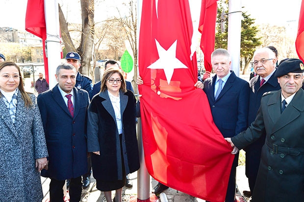 Atatürk Anıtı’na çelenklerin sunulması ile başlayan törende, Türkiye Büyük Millet Meclisi tarafından Gaziantep'e tevcih edilen İstiklal Madalyası, Vali Gül, Milletvekilleri, Büyükşehir Belediye Başkanı Şahin ve protokol heyetince bayrağımıza toka edildi.