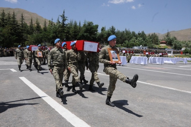HAKKARİ- Çukurca kara yolu üzerindeki Taşbaşı bölgesinde dün yol kontrolü yapan askerlere, PKK'lı teröristler tarafından yapılan saldırıda şehit düşen 8 asker için bugün Hakkari Dağ ve Komando Tugay Komutanlığı'nda tören düzenlendi. Şehit askerler törenin ardından helikopterle Van'a, buradan da toprağa verilmek üzere uçakla memleketlerine gönderildi.