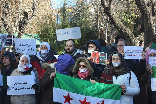 Gaziantep’te, Halep'te yapılan saldırıların durmasını isteyen bir grup Suriyeli, Birleşmiş Milletler (BM) ofisinin önünde ağızlarını bantlarla kapatıp sessizlik eylemi yaptı. Sessizlik eylemi yapan grup ile aynı konu hakkında basın açıklaması yapmak isteyen Suriyeli başka bir grup arasında çıkan arbedeye polis müdahale etti.