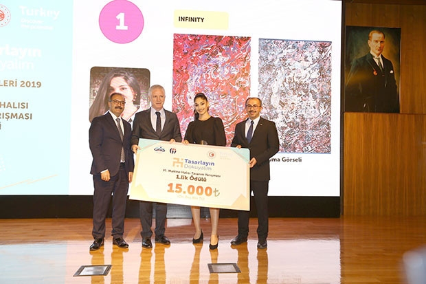 Düzenlenen törende yarışmada Infınıty adlı eseriyle birincilik elde eden Gülbahar Gümüşten’e 15 Bin Türk lirası ödülünü Gaziantep Valisi Davut Gül, Gaziantep Üniversitesi Rektörü Ali Gür ve GAHİB Başkanı Ahmet Kaplan verdi. İkincilik ödülünü Prehistoric Narratıon adlı tasarımıyla kazTasarım yarışmasında üçüncülük ödülünü Aura adlı eseriyle kazanan Nazlı Parçaoğlu ise 8 Bin Türk Lirası ödülünü GAİB Koordinatör Başkanı Ahmet Fikret Kileci, Gaziantep Üniversitesi Rektörü Ali Gür ve GAHİB Baanan Şansım Televi Boğa’ya ödülü olan 11 Bin Türk Lirası ödülü Gaziantep Büyükşehir Belediye Başkan Vekili Erdem Güzelbey, Gaziantep Üniversitesi Rektörü Ali Gür ve GAHİB Başkanı Ahmet Kaplan verdi. şkanı Ahmet Kaplan’dan aldı. Yarışmada dördüncülüğü Lodos adlı eseriyle elde eden Güneş Turhan ise ödülünü TİM Halı Sektör Kurulu Başkanı Salahattin Kaplan ile Gaziantep Üniversitesi Rektörü Ali Gür ve GAHİB Başkanı Ahmet Kaplan’dan aldı. Yarışmada beşincilik ödülünü Rustly adlı tasarımıyla kazanan Şenay Subaşı Avar’a ödülü Hububat Bakliyat Yağlı Tohumlar ve Mamulleri İhracatçıları Birliği Başkanı Mahsum Altunkaya ile Gaziantep Üniversitesi Rektörü Ali Gür ve GAHİB Başkanı Ahmet Kaplan tarafından verildi. Yarışmada finale kalan diğer eser sahiplerine de çeşitli ödüller ve katılım belgeleri verilirken yarışmanın her geçen gün daha da geliştiği ve önümüzdeki süreçte ortaokul ve meslek lisesi öğrencilerini de kapsayacak düzenlemeler yapılacağı ifade edildi.