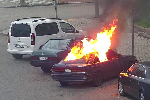 Gaziantep'te camları kırılıp kaportasına hasar verilen otomobilden alevler yükseldi. Söndürülen otomobilden kaya parçası ve plastik bidon içerisinde benzin çıktı.