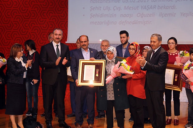 Gaziantep'e 'Gazilik' unvanının verilişinin 97. yıldönümü dolayısıyla Devlet Övünç Tevcih Töreni düzenlendi. Şehit aileleri ve gazilere madalyalarını Adalet Bakanı Abdulhamit Gül verdi. Törende duygusal anlar yaşandı. Suriye’deki teröristler tarafından Türkiye’ye 700 saldırı yapıldığının altını çizen Bakan Gül, “Az önce bir şehidimizi toprağa verdik. Kilis'te, Polateli’nde Yunus Emre kardeşimiz dün Afrin’de şehit oldu. Babası Hanifi Amca ‘ben de şehit olmak için oraya gitmek istiyorum. Ben de bu vatan için çarpışır seve seve canımı veririm’ dedi. Yunus Emre, Fırat Kalkanı operasyonunda da gazi olmuş bir kardeşimizdi. Dün Afrin operasyonunda şehit oldu. Şimdi birileri bu operasyonu, bu harekatı niye başlatınız diyor. İşte yanı başımızda Kilis'e, Gaziantep Havaalanı'na bomba düşmedi mi, bomba düştü. Bütün Kilisli hemşehrilerim her an tehdit altındaydı. Yaklaşık 700 saldırı karşı taraftan, terör unsurları tarafından ülkemize yapıldı. Reyhanlı’da 17 yaşındaki genç bir kızımızı, hayatının baharında cennete uğurladık. Yine teröristler bizi orada tehdit edecekler ama biz böylece elimiz kolumuz bağlı mı duracaktık. Buna karşı bir operasyona başladık diye, birileri bundan rahatsız oldu. Dışarıdan rahatsız olanları anlarız. Bu topraklara gözü olan Türkiye düşmanlarını anlarız. Ama içeride bu operasyona karşı Mehmetçiğimizin moralini bozmaya vatandaşımızın moralini bozmaya kimsenin hakkı yoktur. Buradaki temel mücadele, Türkiye’yi tehdit eden, vatandaşlarımızı tehdit eden bütün terör unsurlarına ve teröristlere karşı yapılan bir mücadeledir. Asla başka bir ülkenin toprağına yönelik, egemenlik hakkına yönelik bir saldırı değildir. Bilakis teröristlerden gelen saldırılara karşı bir meşru müdafaa hakkı olarak Zeytin Dalı Harekatı başlatılmış. Cumhurbaşkanımız, hükumetimizin talimatlarıyla Mehmetçiğimiz tarafından çok büyük bir fedakarlıkla operasyonu başarıyla sürdürmekteyiz. Bu harekat Birleşmiş Milletler (BM) Sözleşmesine uygundur” dedi.