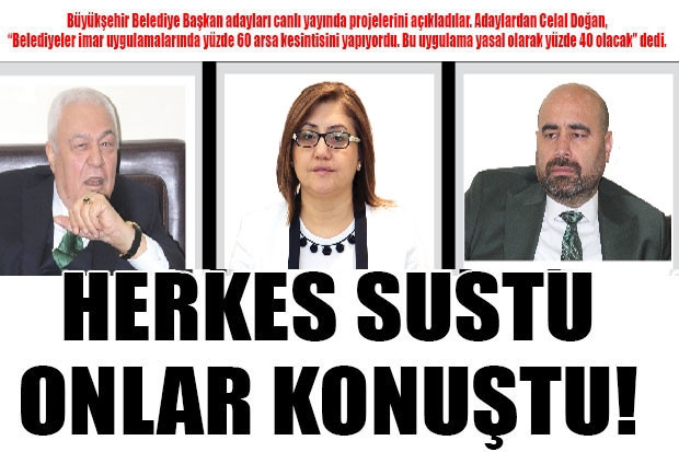 Bir özel TV kanalında Gaziantep’te gerçekleştirdiği sabah haberleri yayınına konuk olan Gaziantep Büyükşehir Belediye Başkan Adayları projelerini anlattılar. Adaylar birbirlerine yönelik siyasi üslubu bozmazken, adaylardan Celal Doğan, belediye meclislerinde aralıksız şekilde gündeme alınan imar konularını gündeme getirdi. Doğan, “Belediyeler imar uygulamalarında yüzde 60 arsa kesintisini yapıyordu. Bu uygulama yasal olarak yüzde 40 olacak” şeklinde konuştu.