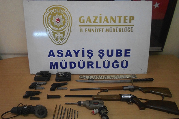 Öte yandan, M.A.D. isimli şüphelinin ikametinde yapılan aramada, 5 adet kuru sıkıdan çevirme tabanca, 2 adet av tüfeği, 10 adet 7.65 mm çapında fişek, 4 adet kuru sıkı fişek, 11 adet değişik çaplarda matkap ucu, 1 adet spiral makinesi, 1 adet kılıç ele geçirildi.