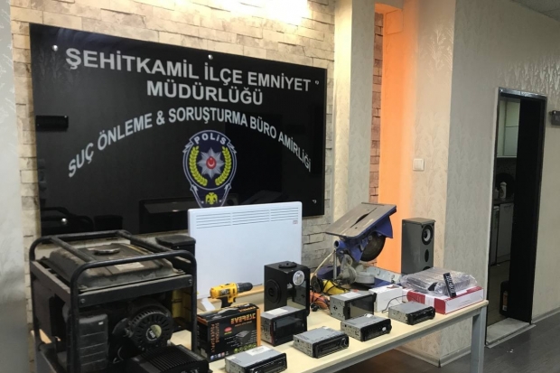 Gaziantep Emniyet Müdürlüğü'ne bağlı Şehitkamil İlçe Emniyet Müdürlüğü ekipleri, Hürriyet Mahallesi'nde bir adrese baskın yaptı. Baskın yapılan adreste hırsızlık malı çalıntı 7 adet oto teybi ve sistemleri, hızar makinası, kompresör, çok sayıda matkap, spiral, şarjlı cihaz ele geçirildi. Ele geçirilen malzemelerle ilgili M.D. isimli şüpheli şahıs yakalandı.
