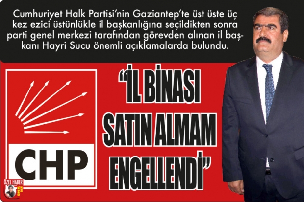 Cumhuriyet Halk Partisi Gaziantep eski İl Başkanı Hayri Sucu, görev yaptığı görev sürecinde il başkanlığına yönelik hizmet binası satın alımı için yoğun şekilde mücadele ettiğini dile getirdi. Sucu, " Tüm pazarlıkları anlaşmaları kontrolleri yapılmış olan 2.800.000 TL ye alacağımız binayı bize aldırmadılar. Bugün aynı bina 10.000.000 TL ye alınamaz duruma gelmiştir" dedi.