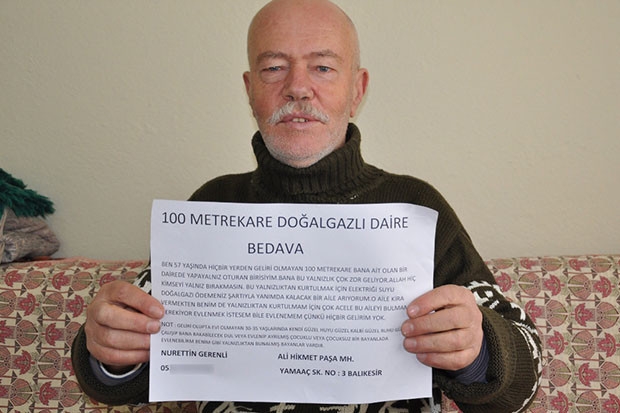 Babasından kalma evde yıllardır tek başına yaşayan 60 yaşındaki Nurettin Gerenli evlenmek için mahallenin yakın çevresindeki elektrik direklerine astığı ilanlarla kısmetini arıyor. Daha önce evinin doğalgazını ödemek suretiyle yanında kalması için aile arayan Nurettin Gerenli emekli olduğunu ve gelirini hayat arkadaşı ile paylaşmak istediğini söyledi. Gerenli, "Ben 60 yaşındayım 2 sene önce emekli oldum ondan önce hiç bir gelirim yoktu. 2 sene önce Bağkur’dan emekli olduktan sonra şimdi bin lira maaşım var. Ben pazarcıydım, pazarcılıktan emekli oldum ve hiç evlenmedim. Ev ölen babamdan miras kaldı, eskiden gelirim yoktu şu anda gelirim var şimdi 35-40 yaşlarında bir hatun arıyorum" dedi.