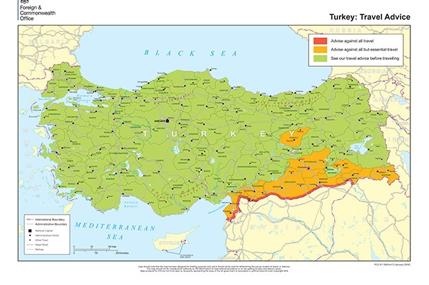 İngiltere hükümeti, yayınladığı duyuru ile Türkiye’ye seyahat edecek vatandaşlarına, Diyarbakır ve Suriye sınırındaki 10 kilometre boyunca seyahat edilmemesi uyarısında bulundu. Öte yandan, uyarıda, Şırnak, Mardin, Şanlıurfa, Gaziantep, Diyarbakır, Kilis, Hatay, Siirt, Tunceli ve Hakkari kentlerine de gidilmemesi gerektiği kaydedildi. Duyuruda, Diyarbakır’ın Sur ilçesinde güvenlik güçlerinin PKK ve diğer örgütlere yönelik operasyonlarının sürdüğü kaydedildi. Benzer operasyonların Şırnak ve Hakkari’de de gerçekleştirildiği aktarılırken, bu bölgelere seyahat edecek vatandaşların dikkatli olmaları gerektiği belirtildi.
