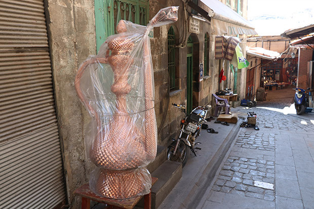 Gaziantepli bakırcı ustası Mehmet Cengiz'in insan boyunda yaptığı dev bakır ibrik, 14 bin TL'ye alıcısını bekliyor.