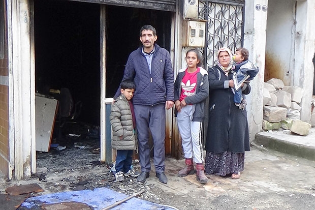 Şahinbey ilçesi Süleyman Şah Mahallesi'nde bilinmeyen bir nedenle berber dükkanı yanan 4 çocuk babası Burhan Tolu yardım bekliyor.