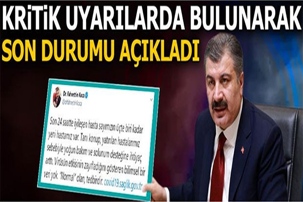 Sağlık Bakanı Fahrettin Koca, Twitter'dan yaptığı paylaşımda, “Son 24 saatte iyileşen hasta sayımızın üçte biri kadar yeni hastamız var. Tanı konup, yatırılan hastalarımız sebebiyle yoğun bakım ve solunum desteğine ihtiyaç arttı. Virüsün etkisinin zayıfladığını gösteren bilimsel bir veri yok. ‘Normal’ olan, tedbirdir” dedi.