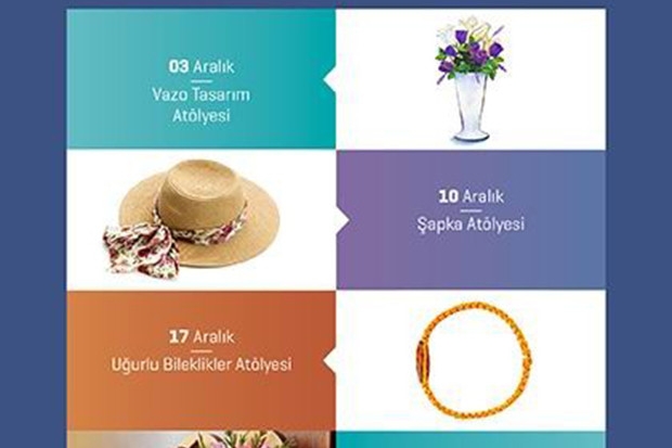 “3 Aralık’ta Vazo Tasarım Atölyesi, 10 Aralık’ta Şapka Atölyesi, 17 Aralık’ta Uğurlu Bileklikler Atölyesi, 24 Aralık’ta Dekoratif Kapı Süsleri Atölyesi gerçekleştirilecek.”