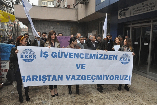 Gaziantep'te, KESK üyesi kadınlar, Sosyal Güvenlik Kurumu İl Müdürlüğü önünde, zor şartlar altında çalıştırıldıklarını ileri sürdükleri yasaları protestoetti.