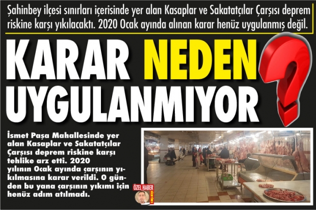 Gaziantep'te yaklaşık 150 işyerinin bulunduğu Kasaplar ve Sakatatçılar Çarşısı ile çevresindeki işyerleri hakkında depreme dayanıksız ve yıkılma riski olduğu gerekçesiyle, Büyükşehir Belediyesi tarafından yıkım kararı alınmıştı. Alınan karar esnafa tebligat ile bildirildi. Alınan bu karara esnaflar ise tepki göstererek, “Bizlere alternatif yer gösterilsin” diye belediye yetkililerine seslendiler.