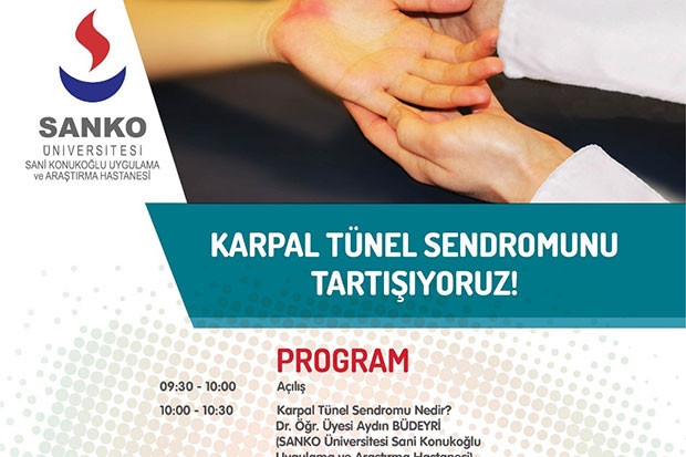 SANKO Üniversitesi Sani Konukoğlu Uygulama ve Araştırma Hastanesi salonunda 8 Nisan 2019 Pazartesi günü düzenlenecek etkinlikte SANKO Üniversitesi Öğretim Üyesi Dr. Öğr. Üyesi Aydın Büdeyri “Karpal Tünel Sendromu Nedir”, Dışkapı Eğitim ve Araştırma Hastanesi’nden Uzm. Dr. Egemen Ayhan “Tamamen Uyanık El Cerrahisi (Wıde Awake Hand Surgery-Walant)”, Gazi Üniversitesi Öğretim Üyesi Doç. Dr. Deran Oskay “Karpal Tünel Sendromunda Rehabilitasyon”, Hacettepe Üniversitesi Öğretim Üyesi Prof. Dr. Çiğdem Öksüz “Karpal Tünel Sendromunda Duyu Eğitimi” konularında sunum yapacak.