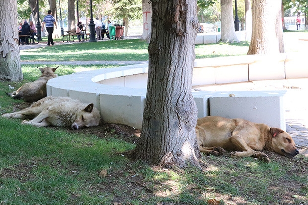 Kavurucu sıcaklıklardan etkilenen sokak hayvanları da ağaç gölgelerinde serinlemeye çalışıyor. Hemen yanlarında yürüyen insanlara aldırış etmeden uyuyan köpekler, biraz ileride yatan insanlarla birlikte ilginç görüntüler oluşturuyor. Sıcakların çarptığı bir grup köpek de Yüzüncü Yıl Parkı'ndaki ağaç gölgesinde yatıyor. Köpekler, açık alanlara göre daha serin olan parklardaki ağaç gölgelerinde uyuyarak, güneşten korunuyor.