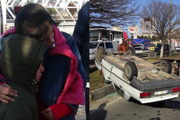 Gaziantep'te ters dönen araçtan yara almadan kurtulan iki çocuktan biri üşüyen kardeşine sarılarak ısıtmaya çalıştı.