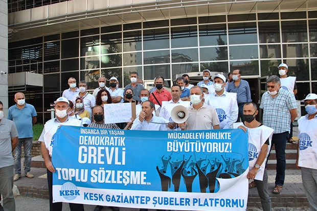 KESK Genel Başkanı Mehmet Bozgeyik, KESK Gaziantep Dönem Sözcüsü Ömer Parlakçı ve KESK’e bağlı sendika temsilcilerinin katılımıyla Gaziantep Gelir İdaresi önünde basın açıklaması düzenlendi. Toplu Sözleşme sonunda kamu çalışanlarına verilen zam oranının yetersiz olduğunu söyleyen KESK Genel Başkanı Mehmet Bozgeyik, zam oranının kabul edilmesinin mümkün olmadığını söyledi. Bozgeyik, “Hükümetin kamu çalışanlarına verdiği zam oranını protesto etmek amacıyla iş bırakma eylemimizi başlatıyoruz. Dünyada ve ülkemizde çok uzun süredir yaşanan ekonomik kriz süreci ile karşı karşıyayız. Yoksulluk ve işsizlik sorunları her geçen gün artarken, kamu çalışanları yoksulluğa mahkum ediliyor.”