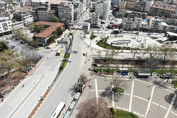 Korona virüs nedeniyle boş kalan Gaziantep’teki meydanlar havadan drone ile fotoğraflandı.