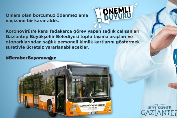Gaziantep Büyükşehir Belediye Başkanı Fatma Şahin, korona virüs (COVID-19) salgınına karşı gece gündüz mücadele eden ve insan sağlığı için yoğun mesai harcayan tüm sağlık çalışanlarının Büyükşehir Belediyesi’ne bağlı toplu taşıma araçlarında ve otoparklarında sağlık personeli kimlik kartlarını göstermeleri halinde ücretsiz yararlanabileceğini açıkladı.