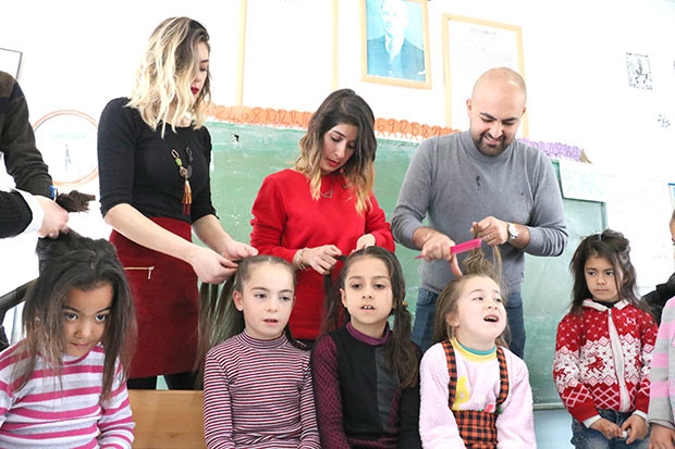 Sosyal sorumluluk projesiyle köy çocuklarının saçlarına dokunduklarını anlatan kuaför Erhan Kaya, “Projemiz düzenli olarak yaptığımız köy okullarındaki kız çocuklarının saçlarına dokunma projesidir. Öğretmenlerimizin de talepleri doğrultusunda olabildiğince farklı okullara gitmeye çalışıyoruz. Çocukların saçlarını kesiyoruz, onlara birazda olsa aramızda bir bağ oluşturmaya çalışıyoruz. Bizim aklımızda kalbimizde olduklarını hissettirmeye çalışıyoruz. Hayatında ilk defa saçlarını kestiren, fön çektiren çocuklar var. Onların sevincine ortak oluyoruz. Daha öncede sosyal sorumluluk projemiz olmuştu benim için ama en güzeli budur” dedi.