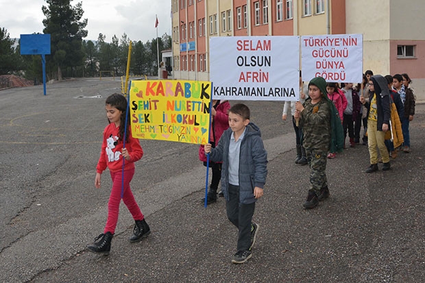 100'üncü Yıl Mahallesi'nde aynı binada eğitim ve öğretim gören Yavuz Sultan Selim Ortaokulu ile Şehit Nurettin Seki İlkokulu öğrencileri, öğretmenleri öncülüğünde ellerinde Türk bayraklarıyla 'Selam olsun Afrin kahramanlarına', 'Türkiye'nin gücünü dünya gördü', 'Bağımsızlığın bekçileri', 'Ordu millet ele ele' yazılı dövizlerle mahalledeki Postane önüne geldi. Öğrenciler, Zeytin Dalı Harekatı'nda bulunan Mehmetçiğe moral vermek amacıyla yazdıkları mektup ve şiirleri okudu. Daha sonra içersinde şiirlerin bulunduğu Türk bayrağı ve Türk askeri resimli zarfları Gaziantep'teki Bornova Jandarma Komando Tugay Komutanlığı'na gönderilmek üzere görevlilere teslim etti. Öğrencilerin harçlıklarından toplanan 2 bin 500 TL ise TSK'nın banka hesap numarasına yatırıldı.