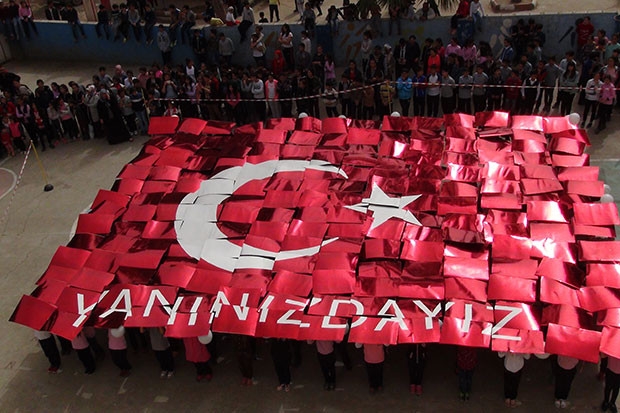 Cumhuriyet Ortaokulunda 200 öğrenci,'Zeytin Dalı Harekatı'na katılan Mehmetçiklere destek amacıyla okulun bahçesinde kartonlarla Dev Türk bayrağı oluşturdu. Koreografide kahraman Mehmetçiğe "Yanınızdayız" mesajı gönderen öğrenciler, Zeytin Dalı Harekatındaki şehitlerin isimlerinin yazıldığı balonları uçurdu. Öğrenciler, "Şehitler ölmez, vatan bölünmez" sloganı attı. Etkinlikte, sınır ötesindeki Mehmetçiklere gönderilmek üzere mektup yazan öğrencilerden Songül Durmuş mektubunu okudu. Okul Müdürü Murat Kurşun, Napolyon'un "Bana Türklerden kurulu bir ordu verin, ben size dünyayı vereyim" sözünü hatırlatarak, "Her Türk asker doğar düsturuyla yola çıktığımızda, her Türk askerse bu ülkenin her tarafı kışla ve her birey Mehmetçiktir. Bizde konu vatan olunca kadın,çocuk ve yaşlı yoktur bizde asker vardır şu an burada bulunan her birey askerdir" dedi.