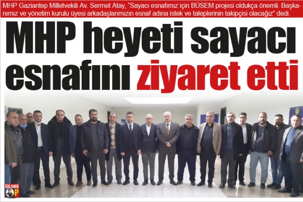 Sayacı esnafını ziyaret eden Milliyetçi Hareket Partisi Gaziantep Milletvekili Av. Sermet Atay ile Milliyetçi Hareket Partisi Gaziantep İl Başkanı Cehit Çıkmaz, esnafla uzun uzun sohbet ettiler. Ziyaretin ardından esnaf temsilcileri MHP heyetine teşekkür etti. Gaziantep Sayacılar Odası Başkanı Mehmet Sarıbal, heyette yer alan tüm isimlere ziyaretten dolayı ayrı ayrı teşekkür etti.