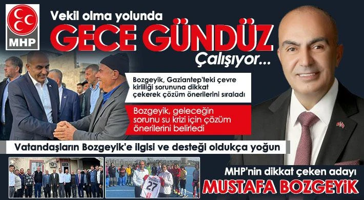 Yıllarca MHP Gaziantep teşkilatının her kademesinde görev alarak emek veren ve bu süreçte Şahinbey ilçe yöneticiliği, Ülkü ocakları il yöneticiliği, MHP Gaziantep il yöneticiliği, Şahinbey ülkü ocakları başkanlığı, il genel meclisi üyeliği, Oğuzeli belediye meclis üyeliği, Oğuzeli Belediye başkan yardımcılığı, Gaziantep Büyükşehir Belediye Başkanı danışmanlığı, MHP Gaziantep il başkan yardımcılığı gibi pek çok zor görevin üstesinden başarıyla kalkan Mustafa Bozgeyik, şimdi de milletvekili olmak için çalışmalarına kesintisiz devam ediyor.