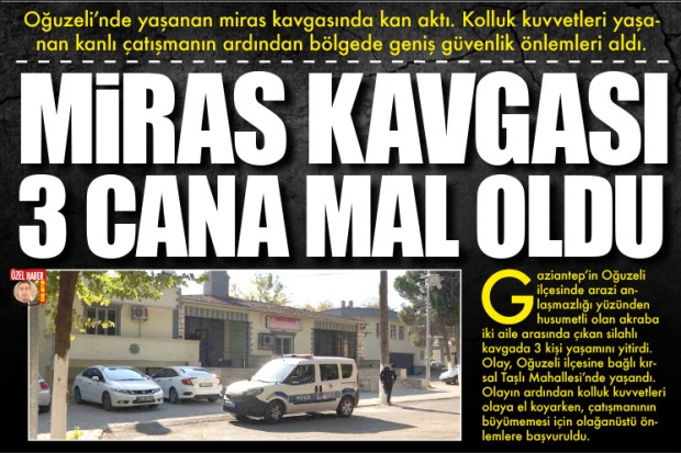 Gaziantep'in Oğuzeli ilçesinde arazi anlaşmazlığı yüzünden husumetli olan akraba iki aile arasında çıkan silahlı kavgada 3 kişi yaşamını yitirdi. Olay, Oğuzeli ilçesine bağlı kırsal Taşlı Mahallesi'nde yaşandı. Olayın ardından kolluk kuvvetleri olaya el koyarken, çatışmanının büyümemesi için olağanüstü önlemlere başvuruldu.