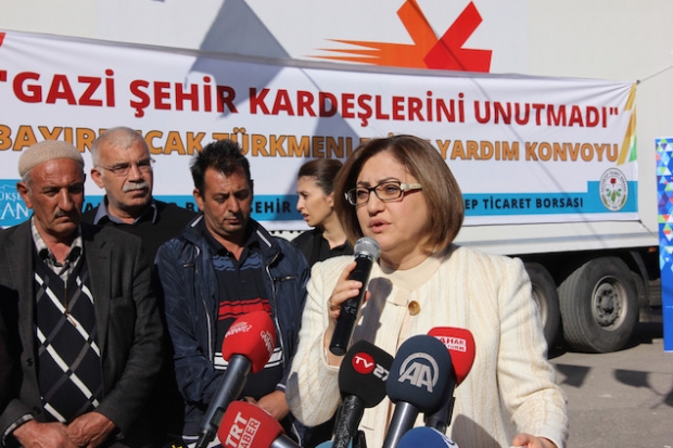 Büyükşehir Belediye Başkanı Fatma Şahin ise 14 TIR yardımın 2 saat içerisinde toplanması nedeniyle çok duygulandığını ifade ederek, “Çok duygu yüklüyüm. Bu şehre olan güvencim sevdam inancım her geçen gün daha da artıyor. Bu yardımları 2 saatte toparladık. Bütün hayırseverlere, sanayicilere, borsa üyelerine, Bayırbucak Türkmenleri için bu destekleri nedeniyle çok teşekkür ediyorum. Bu dağ çok önemli bir dağ stratejik bir dağdır. Zaten bu sınırlar 1921 yılında akrabalar ayrılarak sınıra tel örgüler çekilerek ayrıldı. Onlar bizim akrabalarımız canlarımız her şeyimiz onlar. İstiyorlar ki Bayırbucak Türkmenleri bu mücadeleden vazgeçsin. Büyük oyun sahneye konulsun ve gerçekleşsin. Büyük bir mücadele içindeler gayret içindeler ve bizler onların yanında olduğumuzu bugün bu Tırlarla gösterdik. Bu mücadele bizim mücadelemiz inşallah bu kardeşlerimiz bu mücadeleden zaferle ayrılacaklar. Nasıl ki halkımız 1 Kasımda bu oyunu bozmuşsa bayır bucak Türkmenleri de bu mücadeleyle oradaki oyunu bozacak. Allahın izniyle bu şehir bu insanlık dersini bütün dünyaya gösterecek. Hepimiz kendi vicdanımızda Nobel alacak şehrin Gazi şehir olduğunu görüyoruz. Bundan dolayı çok mutluyuz huzurluyuz. Bölgeye barış gelsin diye mücadele veriyoruz. Barış gelene kadar nerde mağdur, mazlum, yardıma muhtaç varsa onların yanındayız. Biz karanlıkla mücadeleyi aydınlıkla, savaşla mücadeleyi barışla aşacağız. Biz Kobanili kardeşlerimize de yardımlarımızı esirgemedik Suriyeli kardeşlerimize de, Suriye’deki Türkmenlerimize de yardımlarımızı yaptık, yapıyoruz. Bizde ayrım yoktur” şeklinde konuştu.
