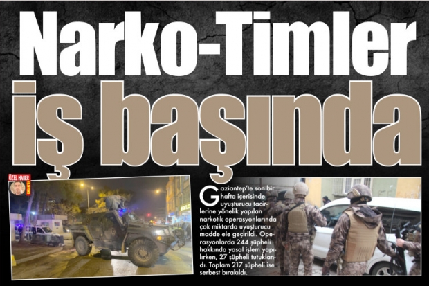 Gaziantep'te son bir hafta içerisinde uyuşturucu tacirlerine yönelik yapılan narkotik operasyonlarında çok miktarda uyuşturucu madde ele geçirildi. Operasyonlarda 244 şüpheli hakkında yasal işlem yapılırken, 27 şüpheli tutuklandı. Toplam 217 şüpheli ise serbest bırakıldı.