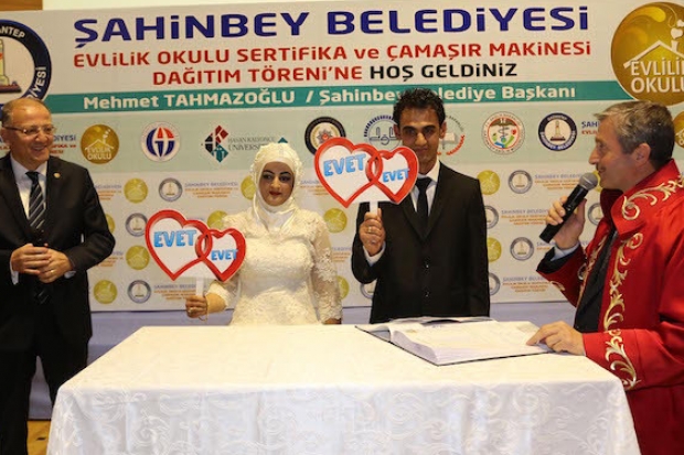 GAZİANTEP'te, merkez ilçe Şahinbey Belediyesi’nin 6 yıldır devam ettirdiği 'Evlilik Okulu’na katılan ve kursu başarıyla tamamlayan çiftler için sertifika ve ödül töreni düzenledi. Okulu bitiren çiftlere belediye tarafından çamaşır makinesi hediye edildi.