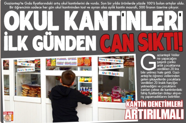 Gaziantep'te okul kantinlerinde gıda ürünleri ateş pahası oldu. Dar gelirli aileler çocuklarına okul harçlığı vermekte zorlanırken, okul kantinlerinde satılan tost ve diğer yiyecek ile içecek fiyatları gelişi güzel belirlenmeye başlandı. Bir tostun 10 ile 15 lira arasında değişen fiyatlarla satıldığı okul kantinlerinde bu rakamlar imarlı bölgelerde yer alan okullarda daha da artıyor. Durun karşısında öğrenci ve veliler okul kantinlerinin her alanda denetlenmesini istiyorlar.