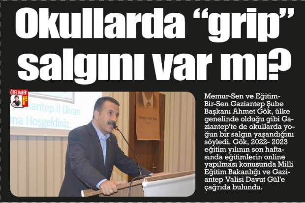 Memur-Sen ve Eğitim-Bir-Sen Gaziantep Şube Başkanı Ahmet Gök, ülke genelinde olduğu gibi Gaziantep’te de okullarda yoğun bir salgın yaşandığını söyledi. Gök, 2022- 2023 eğitim yılının son haftasında eğitimlerin online yapılması konusunda Milli Eğitim Bakanlığı ve Gaziantep Valisi Davut Gül’e çağrıda bulundu.