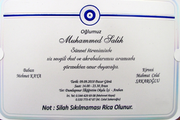 Araban’da bir vatandaş oğlunun sünnet merasimi için bastırdığı davetiyeye ‘Silah sıkılmaması rica olunur’ şeklinde not yazdırdı.