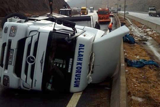 Edinilen bilgiye göre Nurdağı-Gaziantep otoyolunun 20. kilometresinde seyir halindeki H.K yönetimindeki 06 DNU 63 plakalı tır, kaygan zeminde yoldan çıkarak, yan yattı. Kazadan sürücü yara almadan kurtulurken, yol kısa bir süre ulaşıma kapandı. Yaklaşık 1.5 saat tek şeritten kontrollü olarak ulaşımın sağlandığı yol, tırın çekici yardımı ile yeniden trafiğe açıldı.
