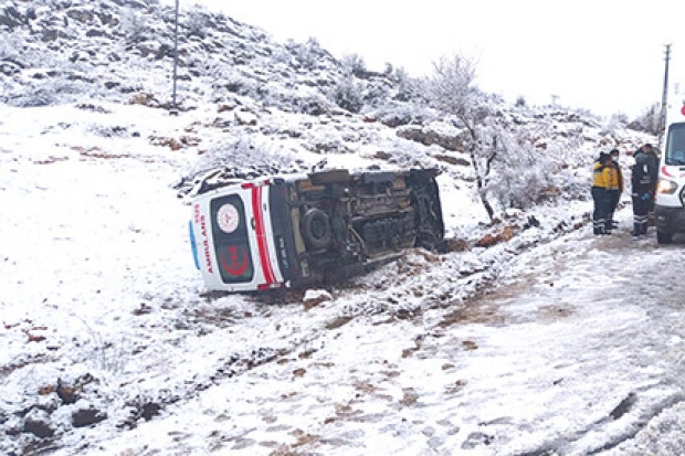 Gaziantep’te hasta almaya giden ambulans karlı yolda kayarak şarampole devrildi. Kazada, ambulans sürücüsü yaralanırken, araçta bulunan sağlık çalışanları kazadan yara almadan kurtuldu.
