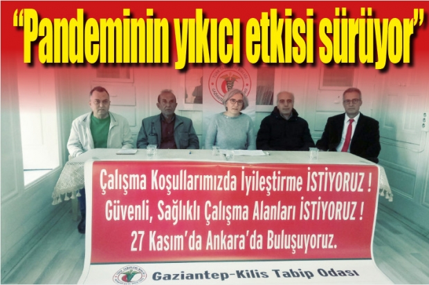 Düzenlediği basın toplantısında konuşan Gaziantep Kilis Tabip Odası Başkanı Ayşegül Tarlan, “Tüm pandemi süreci boyunca hekimler ve sağlık çalışanları uygun olmayan çalışma koşullarında uzun süre çalışmak zorunda kaldı. Sağlık Bakanlığı başta olmak üzere, iktidarın bilimsel bilgiye dayanmayan, şeffaflıktan uzak, yerel dinamikleri gözetmeyen, eksik, yanlış ve tutarsız uygulamalarının bedelini biz sağlıkçılar hayatlarımızla ödedik/ödüyoruz. Pandemi sürecinde öncelikli planlama birinci basamakta yapılması gerekirken; (test, temaslı takibi, yaşam alanlarının salgına göre düzenlenmesi vb.) bu yapılmadı ve salgın hastanelerde karşılandı. Bu plansızlığın sonucu olarak sağlık çalışanlarının iş yükü arttı, çok sayıda sağlık emekçisi hastalığa yakalandı. Uzun saatler kesintisiz çalışma, sık nöbet tutma, her 5 dakikada bir muayene, yoğun iş yükü, şiddete maruz kalma çalışma alanımız olan sağlık kurumlarının olağanı haline geldi. Pandemi öncesinde de karşı karşıya kaldığımız bu sorunlar salgınla birlikte daha da derinleşti, çalışma koşullarımız daha kötü hale geldi” dedi.